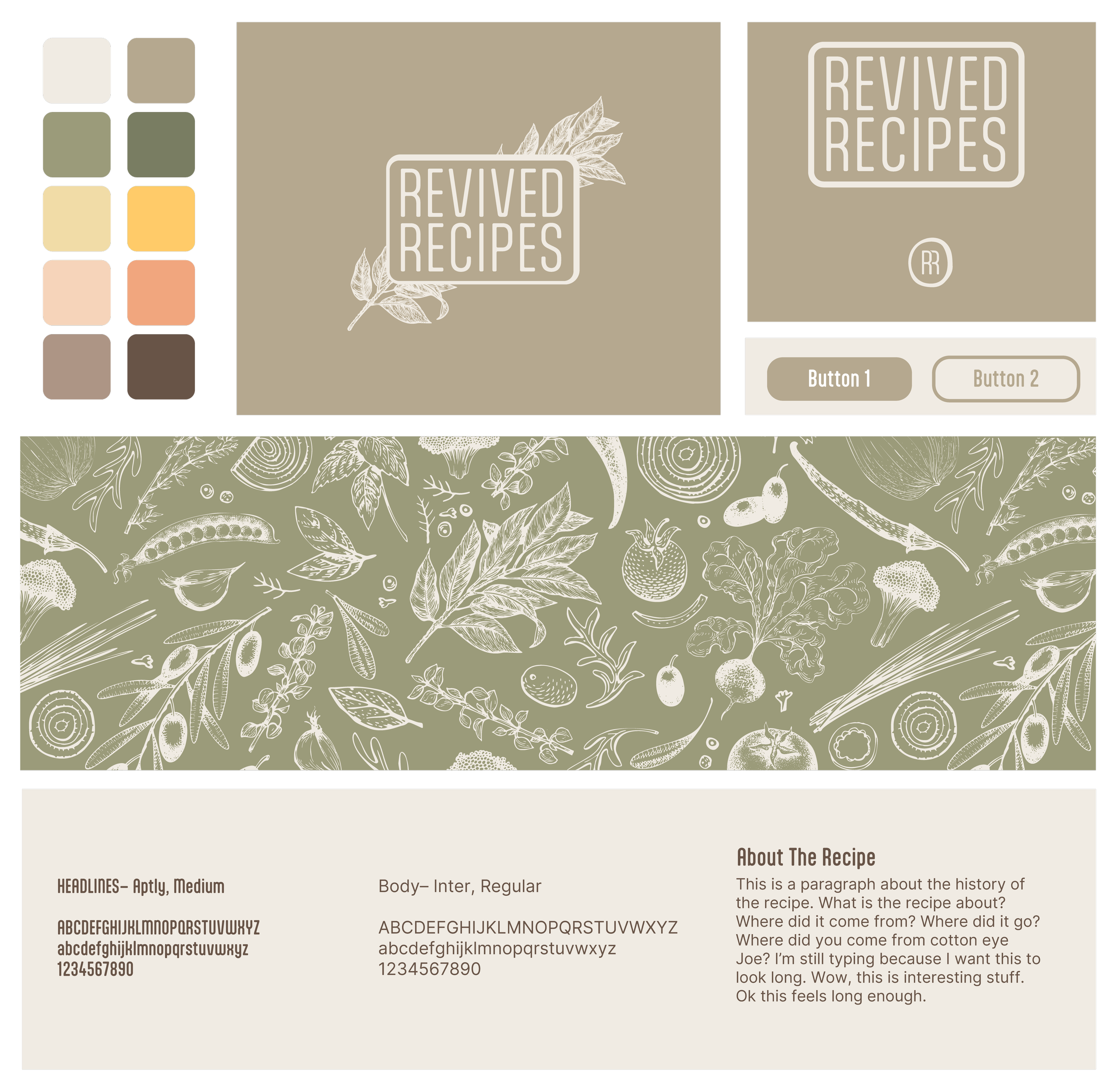For Revived Recipes, I wanted the branding to feel both timeless and approachable. The earthy color palette draws from natural ingredients and aged paper, evoking warmth and nostalgia. I strove to find the connection between history and food while keeping the design fresh and inviting. My goal was to create a visual identity that feels grounded in the past yet relevant today, making forgotten recipes accessible and engaging.