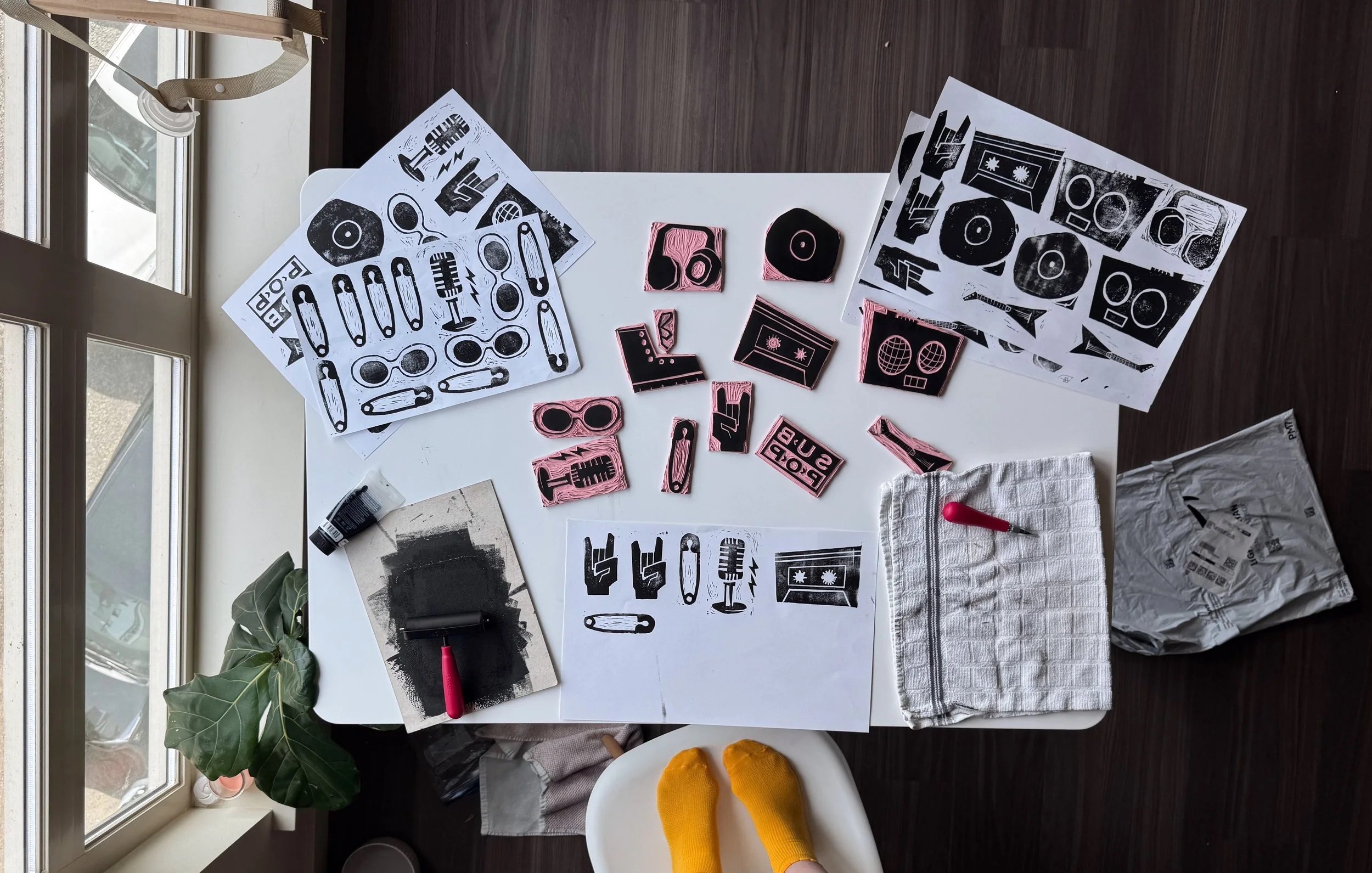 After carving, I rolled black ink onto the blocks with a brayer and made several test prints to adjust pressure and alignment. The textures that appeared naturally from the ink and carving became part of the design’s character.