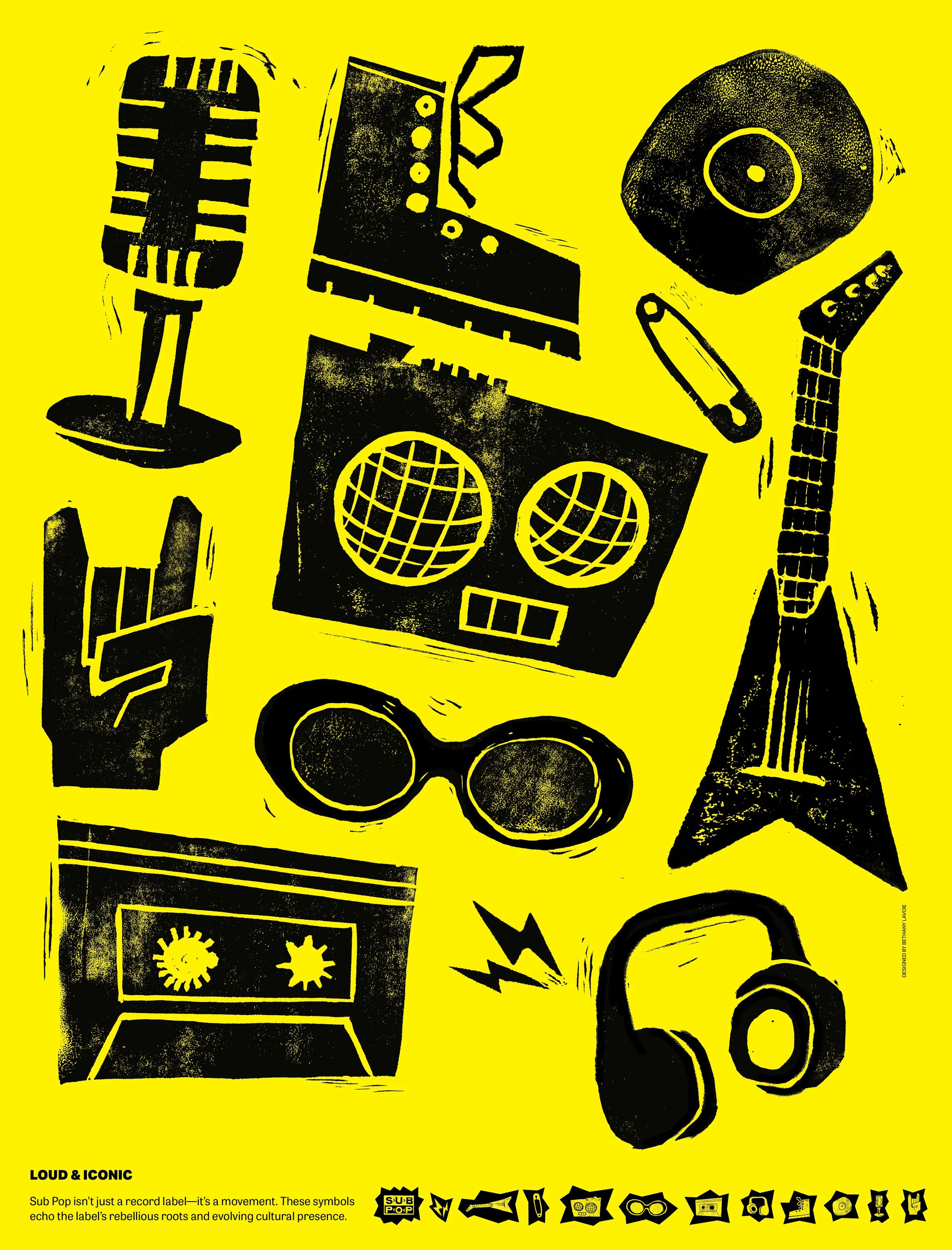 I chose to represent the symbols in the same way Sub Pop exists; loudly! The rough textures, high contrast, and loud yellow background capture the raw energy and rebellious spirit of the label.
